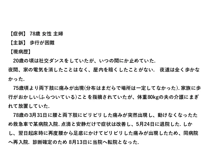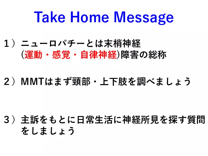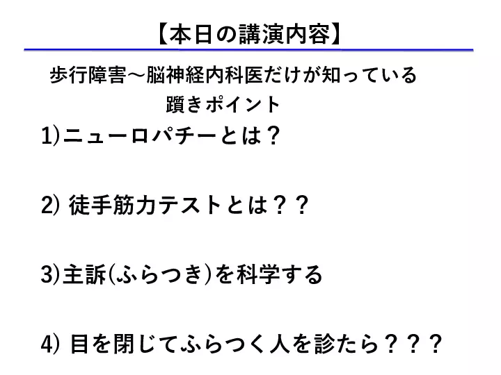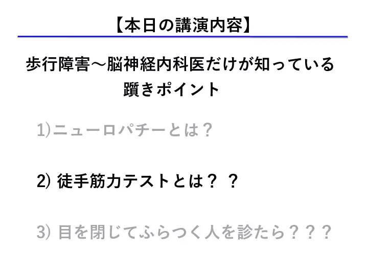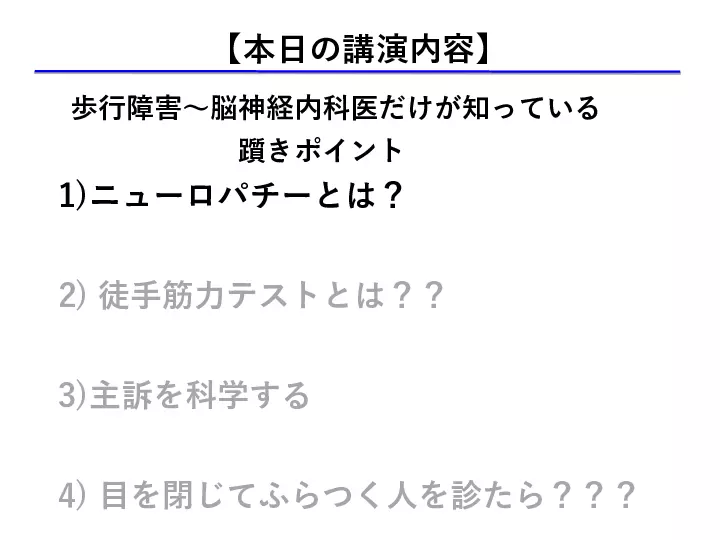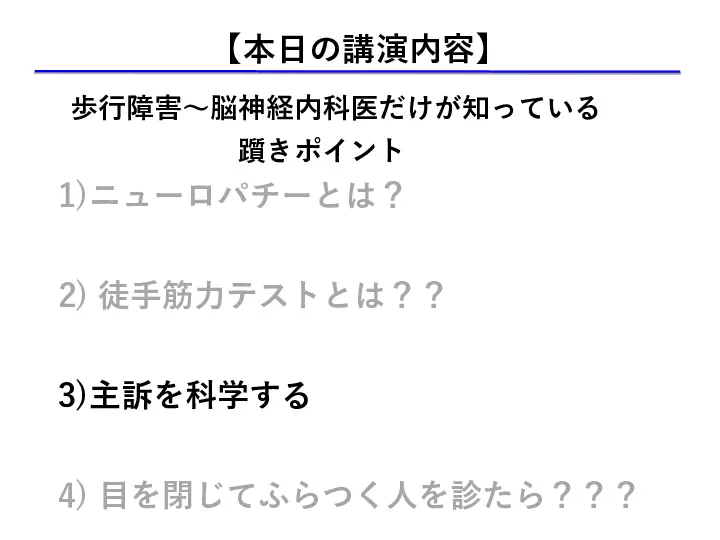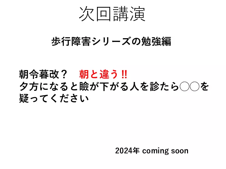 脳神経内科は「覚える神経所見が多すぎて、何から勉強してよいかわからない」、「脳神経疾患の患者さんの診察は苦手だ」、など、巷の声が聞こえてきます。 しかしここで、 1) 脳神経内科は解剖所見など覚えることが多い ⇨重要な解剖所見を理解する 2) 脳神経内科は神経所見の解釈が難しい ⇨重要な神経所見を理解する 3) 聞いたことのない疾患 (希少疾患)が多い ⇨覚えておきたい大切な疾患を知る ことができればいかがでしょうか? 今回は、末梢神経を中心に、脳神経内科領域の診療が少しでも分かりやすく、楽しいものになるように、皆様の明日からの診療に少しでもお役に立てられる講演を目指します。 #歩行障害の診かた、考え方, #神経所見の取り方 #末梢神経障害の診かた #書籍化